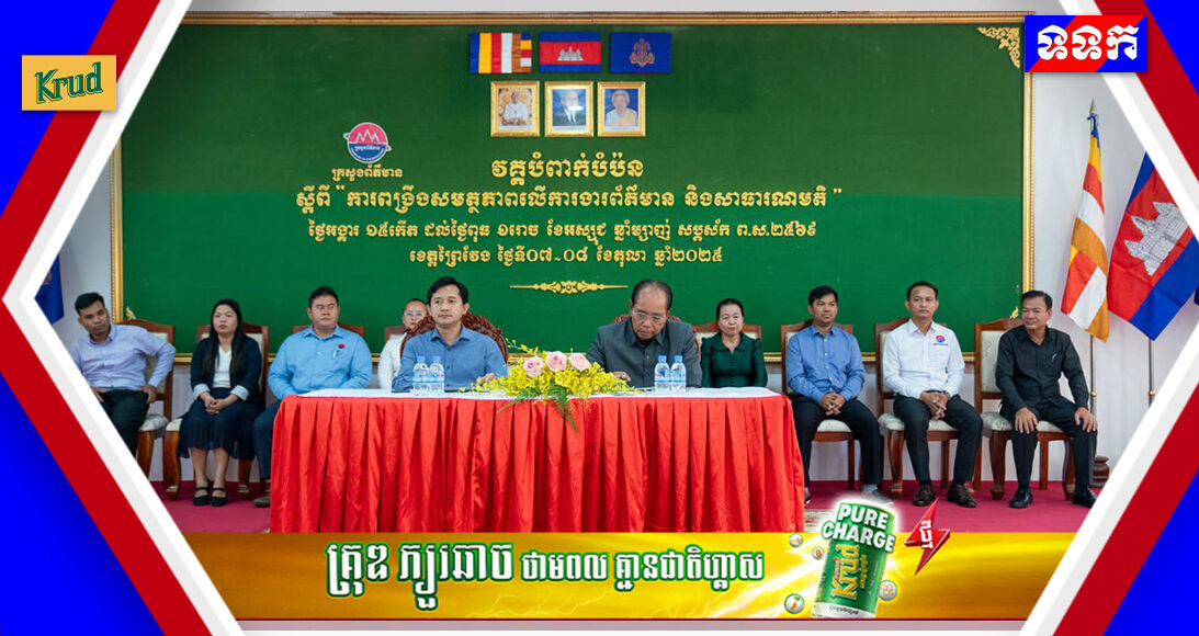 ព្រៃវែង៖ វគ្គបំពាក់បំប៉នស្តីពី ការពង្រឹងសមត្ថភាព លើការងារព័ត៌មាន និងសាធារណមតិ ដែលរៀបចំឡើងដោយក្រសួងព័ត៌មាន សហការជាមួយមន្ទីរព័ត៌មានខេត្តព្រែវែង ចាប់ថ្ងៃទី៧ដល់ថ្ងៃទី៨ ខែតុលា ឆ្នាំ២០២៥បានបិទបញ្ចប់ដោយជោគជ័យ ជាមួយនឹងការផ្ដល់នូវចំណេះដឹងថ្មីៗលើការងារព័ត៌មាន និងសាធារណមតិដល់មន្ត្រីនៃមន្ទីរព័ត៌មាន និងអ្នកសារព័ត៌មានប្រមាណជាង៦០នាក់មកពីខេត្តព្រៃវែង កណ្តាល ស្វាយរៀង និងរាជធានីភ្នំពេញ។