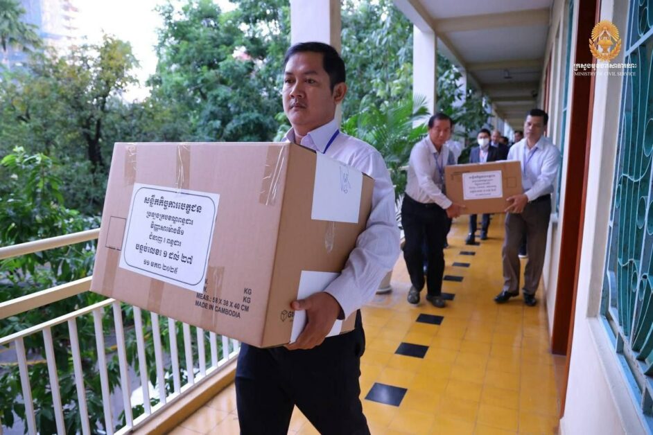 ព្រឹកថ្ងៃទី១២ ខែមករា ឆ្នាំ២០២៥ នៅមណ្ឌលកំណែសាលាភូមិន្ទរដ្ឋបាល ឯកឧត្តម ឧបនាយករដ្ឋមន្ត្រី ហ៊ុន ម៉ានី រដ្ឋមន្ត្រីក្រសួងមុខងារសាធារណៈ និងជាប្រធានគណៈកម្មការរៀបចំការប្រឡងប្រជែង បានអញ្ជើញពិនិត្យដោយផ្ទាល់ទៅលើដំណើរការ និងនីតិវិធីកែសន្លឹកកិច្ចការនៃការប្រឡងប្រជែងជ្រើសរើសមន្ត្រីរាជការ នៃអគ្គនាយកដ្ឋានពន្ធដារ ឱ្យចូលបម្រើការងារក្នុងក្របខណ្ឌក្រសួងសេដ្ឋកិច្ច និងហិរញ្ញវត្ថុ លើវិញ្ញាសាសរសេរលើកទី២។