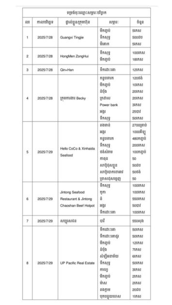 នៅថ្ងៃទី 28 ខែកក្កដា ឆ្នាំ 2025 ក្រោមការផ្តួចផ្តើម និងការដឹកនាំរបស់ឯកឧត្តម ឡោក ហ៊ួរ និង អ្នកឧកញ៉ា លឹម ហួរ នីតូ ក្រុមហ៊ុន Kirisan Group រួមជាមួយក្រុមហ៊ុន Dentajoy, Princess Alanka, ST Market, Rise Commercial, Nuli Industries, Produxer, Velea, Innovative Construction Solution និង Revivre បានរួមគ្នារៀបចំសកម្មភាពបរិច្ចាគសម្ភារៈនៅក្នុងរាជធានីភ្នំពេញ ប្រទេសកម្ពុជា។ សមាគមយុវជនឌីជីថលកម្ពុជា-ចិន និងសមាគមខ្សែក្រវាត់ និងផ្លូវកម្ពុជា-ចិន ក៏បានរួមគ្នាជាមួយសប្បុរសជនគ្រប់មជ្ឈដ្ឋាន ដើម្បីផ្តល់ជំនួយដល់ជនភៀសសឹកនៅជិតប្រាសាទព្រះវិហារតាមព្រំដែនកម្ពុជា-ថៃ។ Influencer ក្នុងស្រុក និង Influencer ចិនជាច្រើននាក់ដូចជា Laor Hours, Sofira Deab, Sopheak Wen, Jasmine Hang, Monny Hang, Pov Pisey បានចូលរួមយ៉ាងសកម្ម។