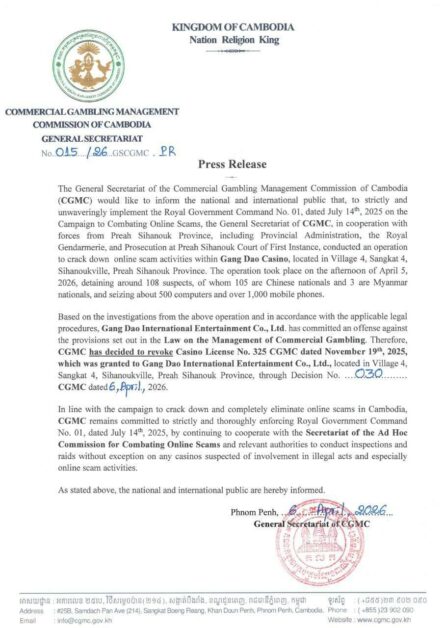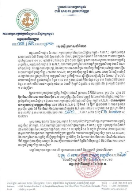 ភ្នំពេញ៖ជនជាតិជប៉ុន៥នាក់ និងចិន៣នាក់ត្រូវបានសមត្ថកិច្ចឃាត់ខ្លួន កាលពីព្រឹកថ្ងៃទី០៦ ខែមេសា ឆ្នាំ២០២៦ នៅអគារខុនដូ JD Polman ស្ថិតក្នុងភូមិបន្លាស្អិត សង្កាត់ឃ្មួញ ខណ្ឌសែនសុខ រាជធានីភ្នំពេញ ពាក់ព័ន្ធការឆបោកតាមប្រព័ន្ធបច្ចេកវិទ្យា Online Scam។