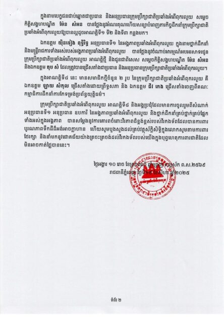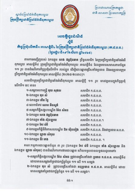 សម្ដេចកិត្តិសង្គហបណ្ឌិត ម៉ែន សំអន ត្រូវបានបោះឆ្នោតជ្រើសតាំងជា ប្រធាន ខណៈឯកឧត្តម តុប សំ ជាអនុប្រធានក្រុមប្រឹក្សាជាតិប្រឆាំងអំពើពុករលួយ អាណត្តិទី៤ (២០២៥-២០៣០)