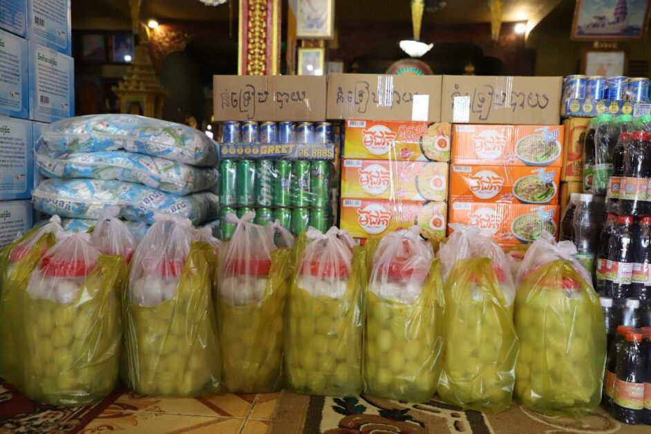សម្រាប់អំណោយជាស្បៀងអាហារ និងសម្ភារប្រើប្រាស់ផ្សេងៗ រួមមានថវិកា ១០លានរៀលដែលជាបច្ច័យរបស់សម្តេច, អង្ករមួយតោន, ទឹកក្រូច ១០កេស, មី ៥កេសធំ, ត្រីខ ៤កេស, សាប៊ូ ៥បាវធំ, ទឹកសុទ្ធ ៥០០កេស, អំបិល ១បាវធំ (៥០គីឡូក្រាម), ទឹកត្រី ១០យួរ, ទឹកស៊ីអ៊ីវ ១០យួរ, ទឹកម្ទេស ២កេសធំ, សៀង ១កេសធំ, នំទ្រៀបបាយ ៣កេស, ថ្នាំផ្ដាសាយ ១កេស, ថ្នាំឈឺបំពង់ក ១កេស និងពងទាប្រៃ ១ពាន់គ្រាប់ ។