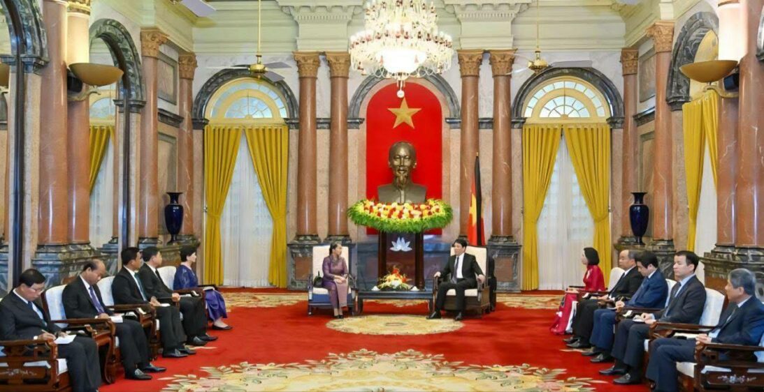 សម្តេចកិតិ្តសង្គហបណ្ឌិត ម៉ែន សំអន អនុប្រធានគណបក្សប្រជាជនកម្ពុជា ជួបសម្តែងការគួរសមចំពោះ ឯកឧត្តម លឿង គឿង (Luong Cuong) ប្រធានរដ្ឋនៃសាធារណៈរដ្ឋសង្គមនិយមវៀតណាម នៅទីក្រុងហាណូយ ប្រទេសវៀតណាម នាព្រឹកថ្ងៃអាទិត្យ ១៤រោច ខែពិសាខ ឆ្នាំម្សាញ់ សប្តស័ក ព.ស.២៥៦៩ ត្រូវនឹង ថ្ងៃទី២៥ ខែឧសភា ឆ្នាំ២០២៥។