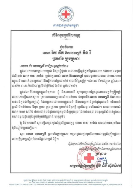 (បន្ទាយមានជ័យ)៖ នៅរសៀលថ្ងៃទី២ ខែមេសា ឆ្នាំ២០២៥ សម្តេចកិត្តិព្រឹទ្ធបណ្ឌិត ប៊ុន រ៉ានី ហ៊ុនសែន ប្រធានកាកបាទក្រហមកម្ពុជា ចាត់ឯកឧត្តម យូ ឡាណា អគ្គលេខាធិការរងទី២ កាកបាទក្រហមកម្ពុជា និងសហការី ព្រមទាំងវត្តមានអញ្ជើញអមដំណើរដោយលោក បឹង គឹមសឹង អនុប្រធានគណៈកម្មាធិការសាខា, លោកស្រី មុយ សុខឡែន លេខាធិការគណៈកម្មាធិការសាខា, លោក ជា យុទ្ធារុណ សមាជិកគណៈកម្មាធិការសាខា ក្រុមប្រតិបត្តិសាខា-អនុសាខា អ្នកស្ម័គ្រចិត្ត និងយុវជនកាកបាទក្រហមកម្ពុជា នាំយកសារលិខិតរំលែកទុក្ខ និងសម្ភាររួមទាំងថវិកាចំនួន២០លានរៀល ជូនក្រុមគ្រួសារ នៃសពពលករខ្មែរ ឈ្មោះ មាស សាវ៉ាង ភេទប្រុស អាយុ ២៣ឆ្នាំ ដែលបានទទួលមរណភាព ដោយការរញ្ជួយដីក្នុងប្រទេសថៃ កាលពីថ្ងៃទី២៨ ខែមីនា ឆ្នាំ២០២៥ ខណៈកំពុងស្នាក់នៅ និងធ្វើការនៅប្រទេសថៃ។ សពត្រូវបានយកមកធ្វើបុណ្យតាមប្រពៃណីនៅឯស្រុកកំណើតស្ថិតនៅក្នុងភូមិបល្ល័ង្គ ឃុំតាគង់ ស្រុកម៉ាឡៃ ខេត្តបន្ទាយមានជ័យ ។ ជាមួយគ្នានេះសាខាកាកបាទក្រហមកម្ពុជាខេត្តបន្ទាយមានជ័យបានចូលរួមថវិកា១លានរៀលជូនក្រុមគ្រួសារសពផងដែរ។