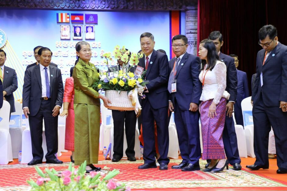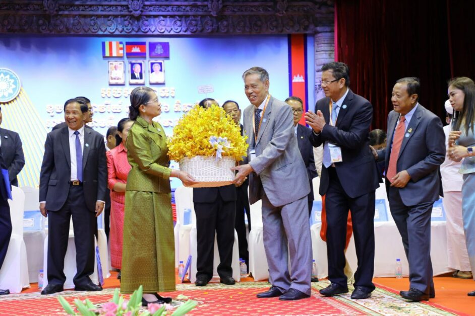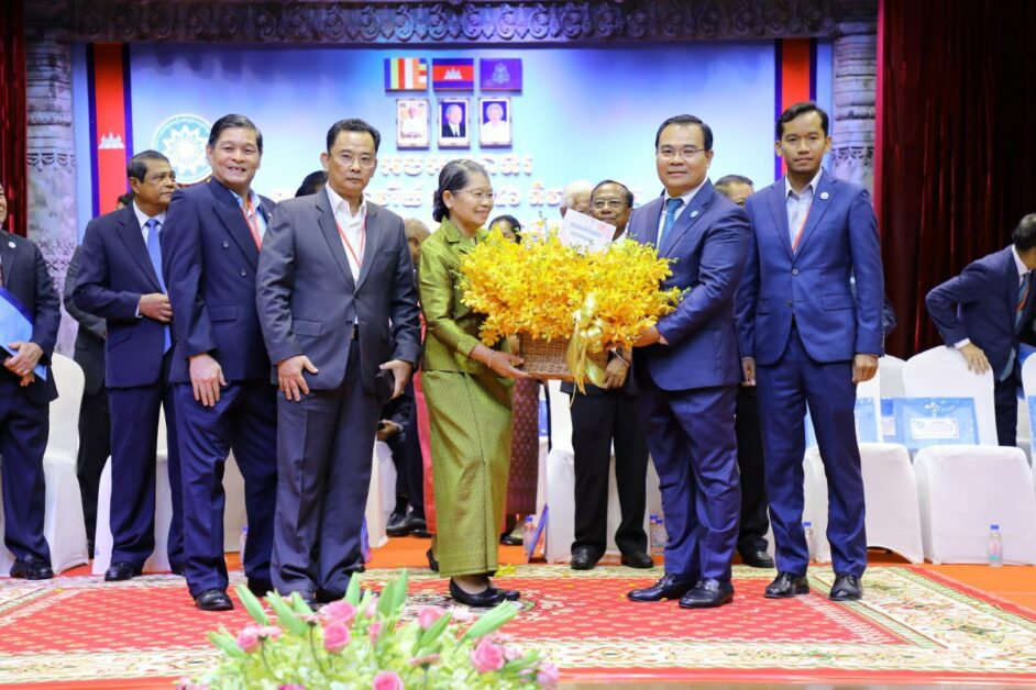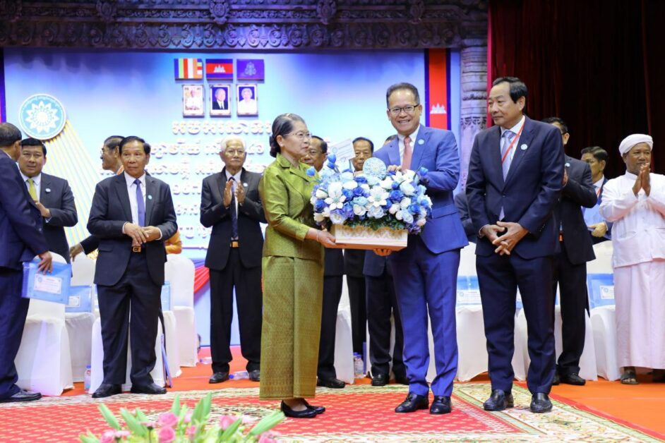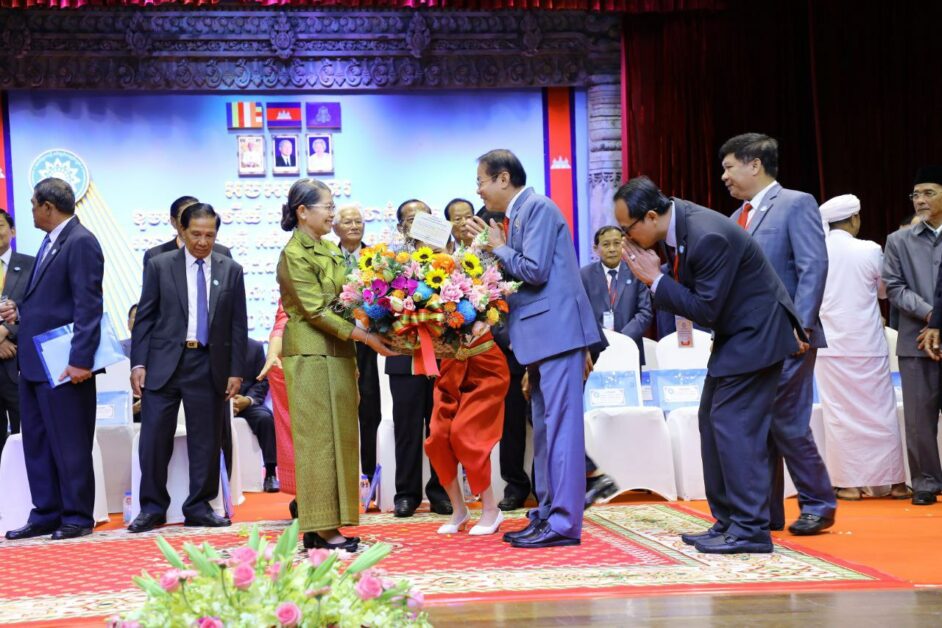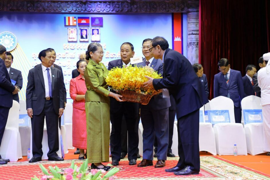 នៅក្នុងឱកាសនេះ ឯកឧត្តម លោកជំទាវ អ្នកឧកញ៉ា លោកឧកញ៉ា លោក លោកស្រី និង សមាជិក សមាជិកា ក្រុមប្រឹក្សាជាតិរណសិរ្សសាមគ្គី អភិវឌ្ឍន៍មាតុភូមិកម្ពុជា តំណាងអង្គទូត តំណាងសេនានុព័ន្ធយោធា តំណាងសមាគមនានា ភ្ញៀវកិត្តិយសជាតិ-អន្តរជាតិ នៃអង្គមិទ្ទិញ បានអញ្ជើញជូនកន្ត្រក់ផ្កា ដល់សម្តេចកិត្តិសង្គហបណ្ឌិត ម៉ែន សំអន ប្រធានក្រុមប្រឹក្សារណសិរ្សសាមគ្គី អភិវឌ្ឍន៍មាតុភូមិកម្ពុជា ផងដែរ៕