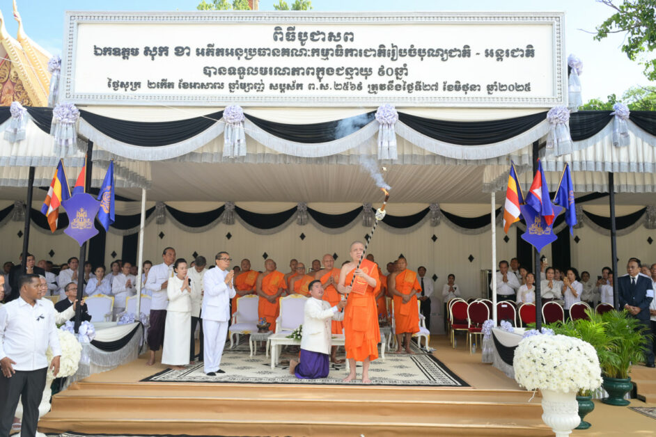 ក្នុងឱកាសដ៏ក្រៀមក្រំ និងពោរពេញដោយសេចក្តីសោកស្តាយនេះ សម្តេចព្រះមហាសុមេធាធិបតីកិត្តិបណ្ឌិត អំ លីមហេង សម្តេចព្រះសង្ឃនាយកនៃព្រះរាជាណាចក្រកម្ពុជា ព្រះអង្គសព្វព្រះរាជហឬទ័យប្រោសប្រទានភ្លើងបូជាសពចំពោះឯកឧត្តម សុក ខា អតីតអនុប្រធានគណៈកម្មាធិការជាតិរៀបចំបុណ្យជាតិ អន្តរជាតិ។