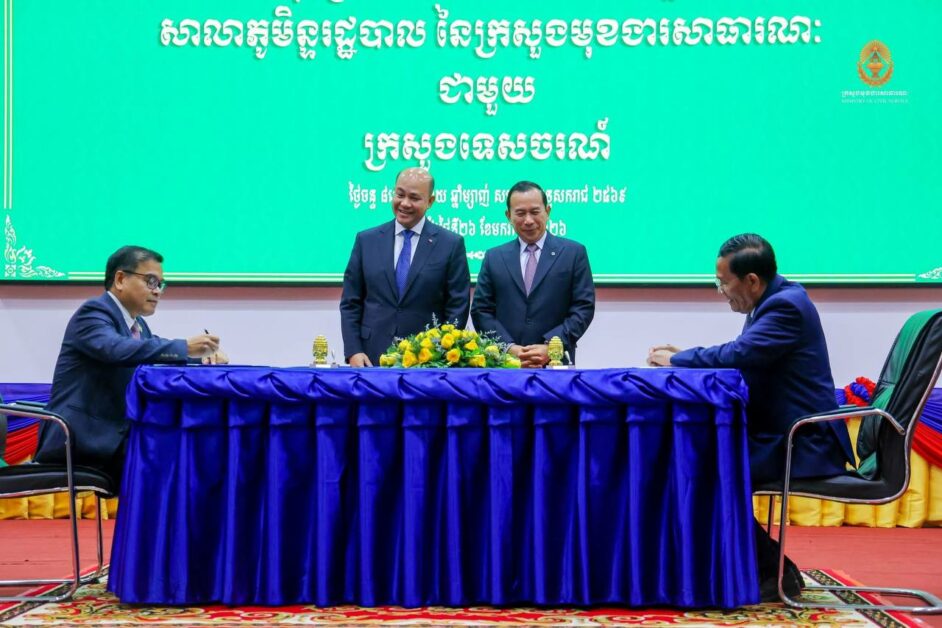 នាព្រឹកថ្ងៃទី២៦ ខែមករា ឆ្នាំ២០២៦នេះ នៅសាលាភូមិន្ទរដ្ឋបាល មានរៀបចំពិធីចុះហត្ថលេខាលើអនុស្សរណៈនៃការ យោគយល់គ្នារវាងសាលាភូមិន្ទរដ្ឋបាលនៃក្រសួងមុខងារសាធារណៈ ជាមួយក្រសួងទេសចរណ៍ ដើម្បីបណ្តុះបណ្តាល និងអភិវឌ្ឍសមត្ថភាពមន្រ្តី។ ពិធីនេះប្រព្រឹត្តទៅក្រោមសហអធិបតីភាពដ៏ខ្ពង់ខ្ពស់ ឯកឧត្តម ហ៊ុន ម៉ានី ឧបនាយករដ្ឋមន្រ្តី រដ្ឋមន្រ្តីក្រសួងមុខងារសាធារណៈ និងជាប្រធានក្រុមប្រឹក្សាភិបាលនៃសាលាភូមិន្ទរដ្ឋបាល និង ឯកឧត្តម ហួត ហាក់ រដ្ឋមន្រ្តីក្រសួងទេសចរណ៍ ព្រមទាំងមានការអញ្ជើញចូលរួមពី ថ្នាក់ដឹកនាំ គណៈគ្រប់គ្រងសាលា និងមន្រ្តីរាជការនៃក្រសួងមុខងារសាធារណៈនិងសាលាភូមិន្ទរដ្ឋបាល ថ្នាក់ដឹកនាំ និងមន្រ្តីរាជការនៃក្រសួងទេសចរណ៍ សរុបប្រមាណជាង ២០០នាក់។