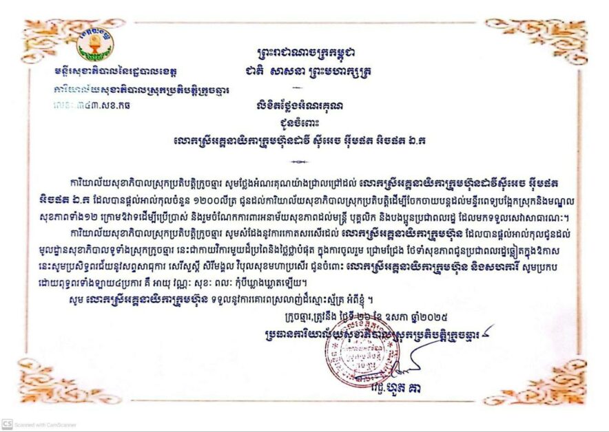 ក្នុងឱកាសនោះប្រធានការិយាល័យសុខាភិបាលស្រុកប្រតិ្តបត្រក្រូចឆ្មារ បានសំដែងនូវការកោតសរសើរ ដល់លោកស្រី ជា ដាវី ម្ចាស់សិប្បកម្មក្រុមហ៊ុន ដាវីស៊ីអេច ចំពោះការផ្ដល់នូវសម្ភារប្រើប្រាស់ជាអាល់កុលទឹកទាំងនេះ ដែលជាកាយវិការមួយដ៏ល្អប្រពៃ និងថ្លៃថ្លាបំផុតដែលបានដើរតួនាទីដ៏សំខាន់សម្រាប់បម្រើការក្នុងអង្គភាព និងទុកប្រើប្រាស់ នៅពេលដែលមាន ជំងឺរាតត្បាតនៃជំងឺឆ្លងផ្សេងៗ ដើម្បីចូលរួមចំណែកលើកកម្ពស់សុវត្តិភាពសុខភាពសាធារណៈរបស់មន្រ្តីក្រោមឪវាទផងដែរ៕