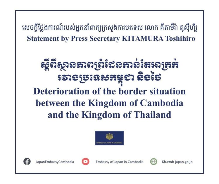 ២. ភាពប្រសើរឡើងវិញនៃទំនាក់ទំនងរវាងប្រទេសកម្ពុជា និងថៃមានសារៈសំខាន់ណាស់សម្រាប់ស្ថិរភាព និងការអភិវឌ្ឍក្នុងតំបន់ទាំងមូល។ រដ្ឋាភិបាលជប៉ុនកំពុងតែតាមដានដោយយកចិត្តដាក់នូវការវិវត្តនៃស្ថានភាពរវាងប្រទេសទាំងពីរដោយក្តីបារម្ភ ហើយប្រឆាំងនឹងសកម្មភាពណាមួយដែលអាចធ្វើឱ្យស្ថានការណ៍កាន់តែតានតឹងឡើង។ ជប៉ុនសូមធ្វើការអំពាវនាវជាថ្មីម្តងទៀតដល់ប្រទេសទាំងពីរឱ្យគោរពតាមកិច្ចព្រមព្រៀងបទឈប់បាញ់ អនុវត្តការអត់ធ្មត់ជាអតិបរមា និងស្វែងរកដំណោះស្រាយដោយសន្តិវិធីតាមរយៈការសន្ទនា ស្របតាមស្មារតីនៃសេចក្តីថ្លែងការណ៍រួមដែលធ្វើឡើងនៅថ្ងៃទី ២៦ ខែតុលា។