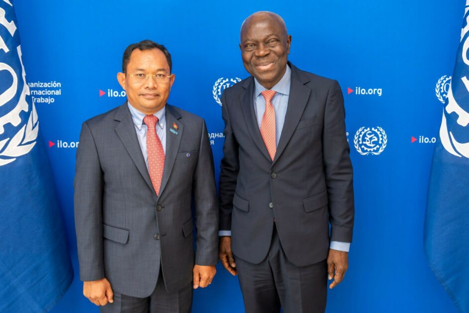 (ហ្ស៊ឺណែវ ប្រទេសស្វីស)៖ នារសៀលថ្ងៃទី៩ ខែមិថុនា ឆ្នាំ២០២៥ ឯកឧត្តម សោម ចំណាន រដ្ឋលេខាធិការ តំណាងដ៏ខ្ពង់ខ្ពស់ឯកឧត្តម ហេង សួរ រដ្ឋមន្រ្តីក្រសួងការងារ និងបណ្តុះបណ្តាលវិជ្ជាជីវៈ បានជួបពិភាក្សាការងារទ្វេភាគីជាមួយឯកឧត្តម Gilbert F. Houngbo អគ្គនាយកអង្គការអន្តរជាតិខាងការងារ (ILO) អំឡុងបំពេញបេសកកម្មចូលរួមសន្និសីទអន្ដរជាតិខាងការងារលើកទី១១៣ នៅទីស្នាក់ការអង្គការសហប្រជាជាតិ ទីក្រុងហ្ស៊ឺណែវ។