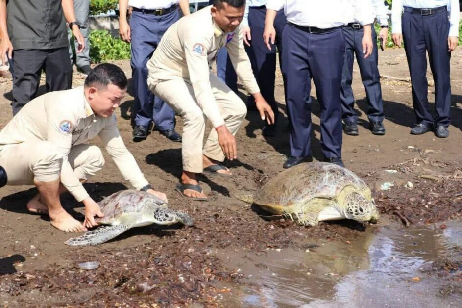 អណ្តើកសមុទ្រចំនួន ២ក្បាល ត្រូវបានព្រលែងចូលសមុទ្រវិញ ក្រោយទទួលបានពីអ្នកនេសាទ នៅខេត្តកែប