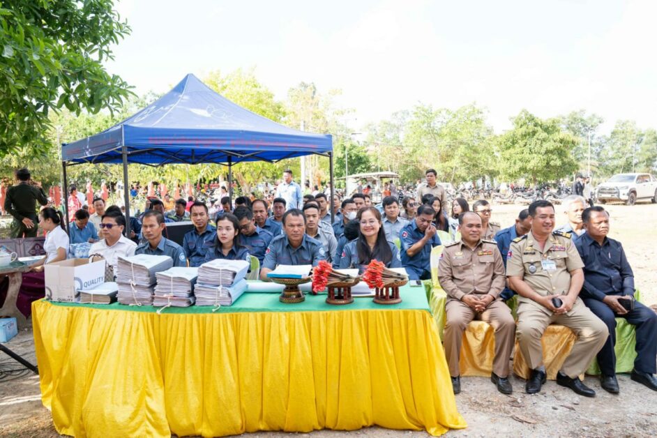 នៅព្រឹកថ្ងៃទី៤ ខែមីនា ឆ្នាំ២០២៥ ឯកឧត្តម ម៉ៅ ធនិន អភិបាលខេត្តកំពត បានអញ្ជើញជាអធិបតីក្នុងពិធីចែកបណ្ណកម្មសិទ្ធ (វិញ្ញាបនបត្រសម្គាល់ម្ចាស់អចលនវត្ថុ) ក្នុងភូមិហុងស៊ុយ ឃុំបន្ទាយមាសខាងលិច និងពិធីប្រកាសបិទផ្សាយជាសាធារណៈនូវឯកសារនៃការវិនិច្ឆ័យ ដែលបានចុះបញ្ជីមានលក្ខណៈជាប្រព័ន្ធ ក្នុងភូមិត្រពាំងពោន ភូមិក្រសាំងលើ ភូមិក្រសាំងកម ឃុំបន្ទាយមាសខាងកើត ភូមិទួលក្រសាំង និងភូមិម៉ឹនដាំ ឃុំព្រៃទន្លេ ស្រុកបន្ទាយមាស ខេត្តកំពត ដែលពិធីនេះបានប្រារព្ធធ្វើឡើងក្នុងបរិវេណវត្តអូរជុំ ស្ថិតក្នុងភូមិព្រៃទន្លេ ស្រុកបន្ទាយមាស ខេត្តកំពត។