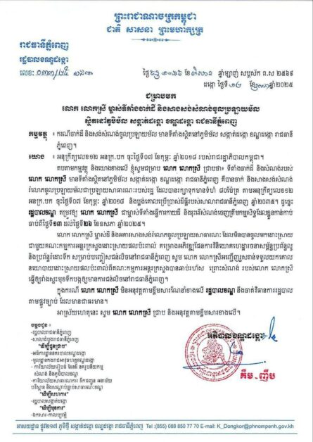 ភ្នំពេញ ៖ អាជ្ញាធរខណ្ឌដង្កោ ទុកពេល១៤ ចាប់ពីថ្ងៃទី១៣ ដល់ថ្ងៃទី២៦ ខែឧសភា ឆ្នាំ២០២៥ អោយម្ចាស់ទីតាំង រុះរោះនិងកាយដីចេញ ពីប្រឡាយម័ល ស្ថិតនៅភូមិម័រ សង្កាត់ដង្កោ ខណ្ឌដង្កោ រាជធានីភ្នំពេញ។