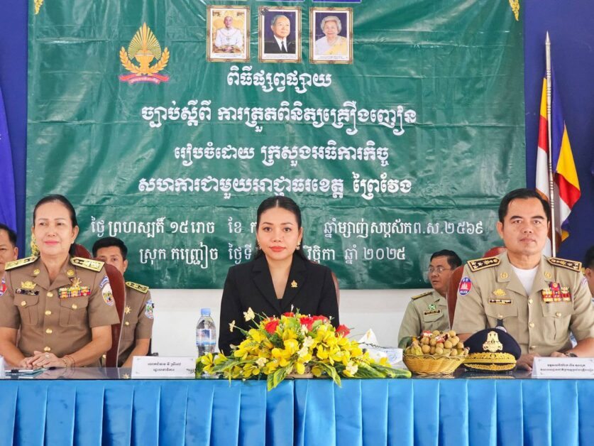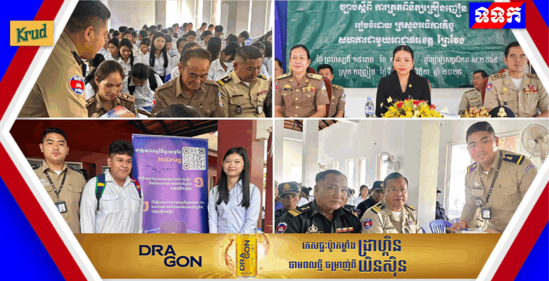 ខេត្តព្រៃវែង ៖ ថ្ងៃទី២០ ខែវិច្ឆិកា ឆ្នាំ២០២៥ អាជ្ញាធរជាតិប្រយុទ្ធប្រឆាំងគ្រឿងញៀន ក្រសួងអធិការកិច្ច និងរដ្ឋបាលខេត្តព្រៃវែងរួមគ្នាផ្សព្វផ្សាយច្បាប់ស្តីពីការត្រួតពិនិត្យគ្រឿងញៀន និងជំរុញប្រើប្រាស់ App NoDrug ដល់មន្រ្តីរាជការ កងកម្លាំង អាជ្ញាធរមូលដ្ឋាន សិស្សានុសិស្សនៅស្រុកកញ្រ្ចៀច ខេត្តព្រៃវែង។