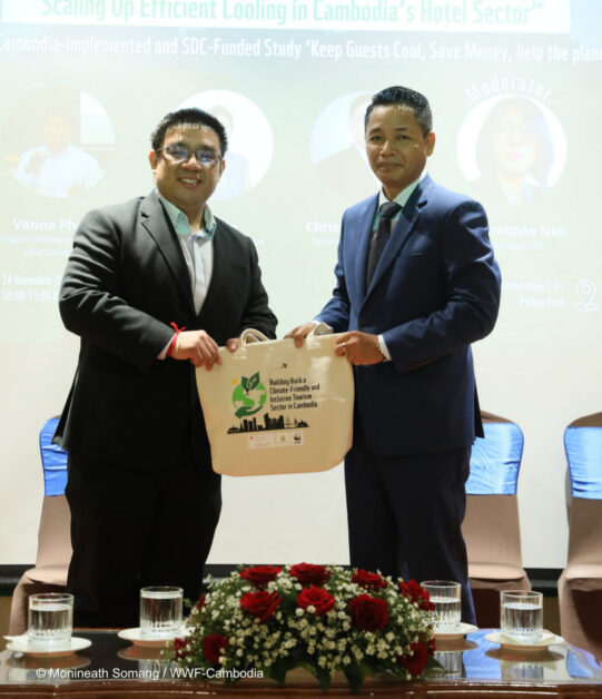 តាមរយៈគម្រោង Cool & Solar ដែលគាំទ្រដោយទីភ្នាក់ងារអភិវឌ្ឍន៍ និងសហប្រតិបត្តិការស្វីស (SDC) អង្គការ WWF-កម្ពុជា បានធ្វើការយ៉ាងជិតស្និទ្ធជាមួយសណ្ឋាគារឈានមុខគេដូចជា Raffles Le Royal, Sofitel Puketra, Himawari, Sunway និង Empress Angkor ដើម្បីស្វែងរកដំណោះស្រាយ ដែលធ្វើឱ្យ energy efficiency មានភាពប្រសើរឡើង និងជាលទ្ធផលគឺគួរជាទីចាប់អារម្មណ៍។ ការធ្វើការត្រួត ពិនិត្យប្រសិទ្ធភាពនៃថាមពលលម្អិតបានបង្ហាញថា សណ្ឋាគារអាចសន្សំបានរហូតដល់ ១០០,០០០ដុល្លាអាមេរិកក្នុងមួយឆ្នាំ តាមរយៈ efficiency upgrades ជាមួយនឹងការសងត្រលប់ក្នុងរយៈពេលខ្លី ត្រឹមតែ៣ ឆ្នាំប៉ុណ្ណោះ។ ទាំងនេះមិនមែនគ្រាន់តែជាតួលេខនោះទេ ប៉ុន្តែវាបានសបញ្ជាក់ឱ្យឃើញថាការប្រកួតប្រជែងអាជីវកម្ម ការកាត់បន្ថយកាបូន និងការរួមចំណែក គឺជាមាគ៌ានាំទៅរកកំណើនធម្មជាតិនៅកម្ពុជា។