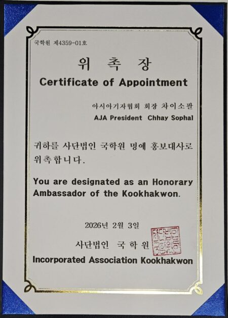 សេអ៊ូល៖ ឯកឧត្តមបណ្ទិត ឆាយ សុផល រដ្ឋលេខាធិការក្រសួងព័ត៌មាន នៅសប្តាហ៍នេះ ត្រូវបានវិទ្យាស្ថាន Kookhakwon ឬ វិទ្យាស្ថានសិក្សាវប្បធម៌កូរ៉េពីបូរាណ (Institute for Traditional Korean Culture Studies) តែងតាំងជាឯកអគ្គរដ្ឋទូតកិត្តិយសម្រាប់វិទ្យាស្ថាននេះ។