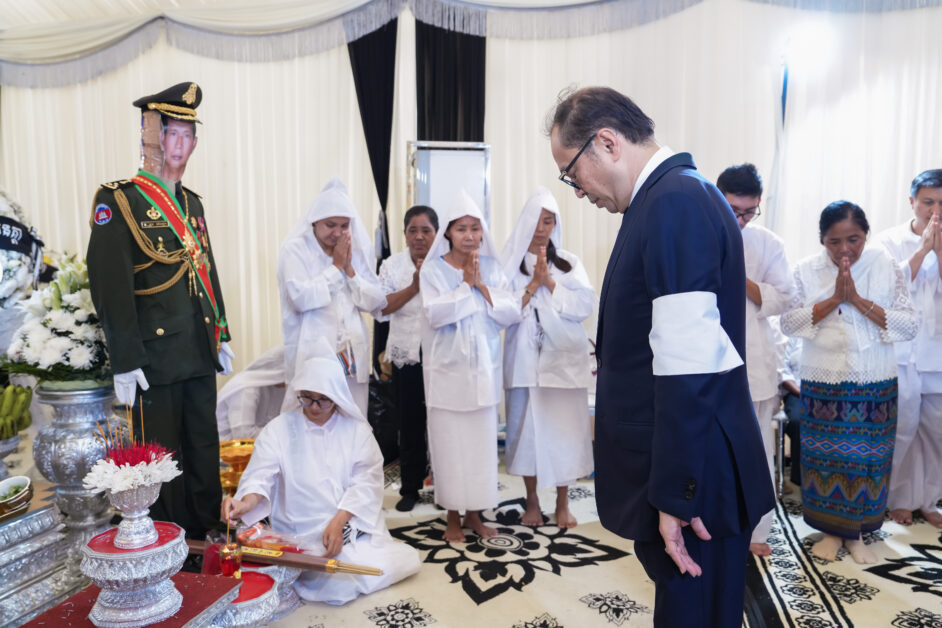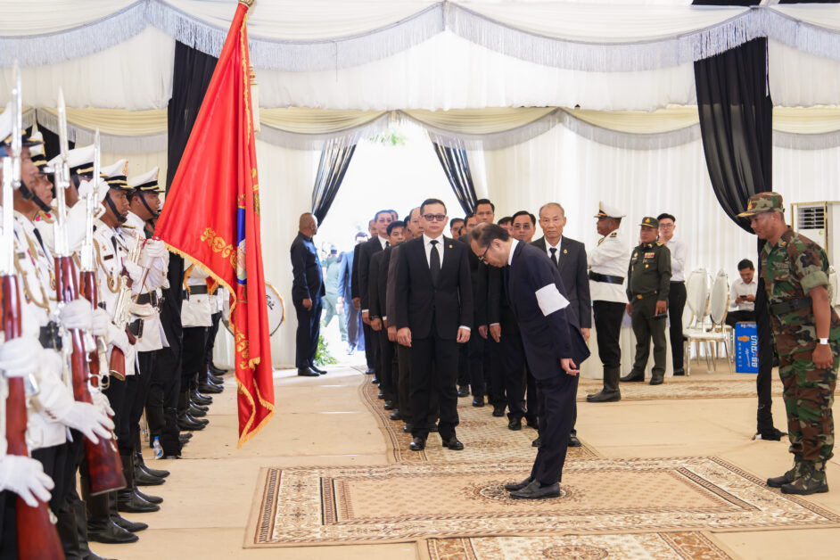 (ភ្នំពេញ)៖ នារសៀលថ្ងៃទី២៨ ខែកក្កដា ឆ្នាំ២០២៥ ឯកឧត្តម វង្សី វិស្សុត ឧបនាយករដ្ឋមន្រ្តីប្រចាំការ រដ្ឋមន្រ្តី​ទទួលបន្ទុកទីស្តីការគណៈរដ្ឋមន្រ្តី អមដំណើរដោយថ្នាក់ដឹកនាំនិងមន្ត្រីនៃទីស្តីការគណៈរដ្ឋមន្ត្រី បានអញ្ជើញគោរពវិញ្ញាណក្ខន្ធ ឯកឧត្តម ឧត្តមសេនីយ៍ឯក ដួង សំនៀង មេបញ្ជាការកងពលតូចអន្តរាគមន៍លេខ៧ ដែលបានពលីជីវិតជូនជាតិមាតុភូមិ ក្នុងសមរភូមិប្រយុទ្ធជាមួយសត្រូវឈ្លានពានទឹកដីក្នុងភូមិសាស្ត្រខេត្តព្រះវិហារ កាលពីថ្ងៃសៅរ៍ ១កើត ខែស្រាពណ៍ ឆ្នាំម្សាញ់ សប្តស័ក ព.ស.២៥៦៩ ត្រូវនឹងថ្ងៃទី២៦ ខែកក្កដា ឆ្នាំ២០២៥ ក្នុងជន្មាយុ៦៧ឆ្នាំ។