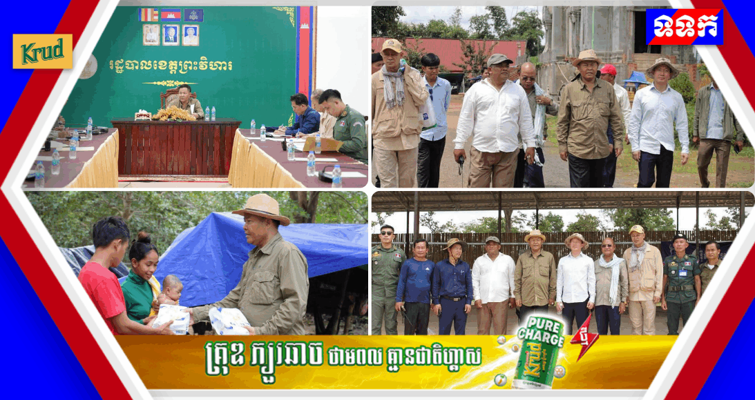 ឯកឧត្តម ឌឿន សុវណ្ណ រដ្ឋលេខាធិការក្រសួងមហាផ្ទៃ បានអញ្ជើញចុះពិនិត្យកង្វះខាត និងសម្របសម្រួលការរៀបចំទីតាំងសុវត្ថិភាព ជម្រកស្នាក់នៅបណ្តោះអាសន្ន ការដឹកជញ្ជូន ការដោះស្រាយសេវាសាធារណៈ ព្រមទាំងជួបសំណេះសំណាលសាកសួរសុខទុក្ខ និងបាននាំយកអំណោយមកចែកជូនបងប្អូនប្រជាពលរដ្ឋដែលនៅតាមជំរំភៀសសឹកក្នុងភូមិសាស្ត្រខេត្តព្រះវិហាររួមមាន ទីសុវត្ថិភាពវត្តពោធិ៍ ៥០០០ ដើម, វត្តទួលអណ្តែត, វត្តត្រាវកៀត, វត្តពើងអង្គាម, វត្តពើងព្រះគោ ដើម្បីដឹងពីទុក្ខលំបាក កង្វះខាត ព្រមទាំងបញ្ហាដែលបងប្អូនប្រជាពលរដ្ឋកំពុងប្រឈម ដើម្បីរាយការណ៍ទៅកាន់ឯកឧត្តមអភិសន្តិបណ្ឌិត ស សុខា ឧបនាយករដ្ឋមន្ត្រី រដ្ឋមន្ត្រីក្រសួងមហាផ្ទៃ រៀបចំផែនការចុះមកសម្របសម្រួល និងដោះស្រាយបញ្ហាដែលបងប្អូនកំពុងជួបប្រទះនូវតាមជំរំភៀសសឹក។