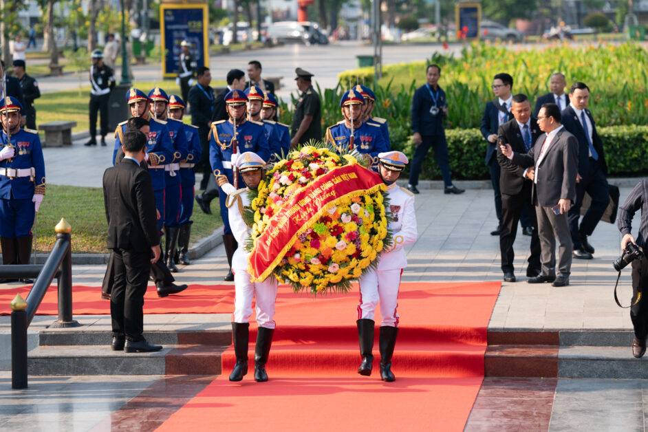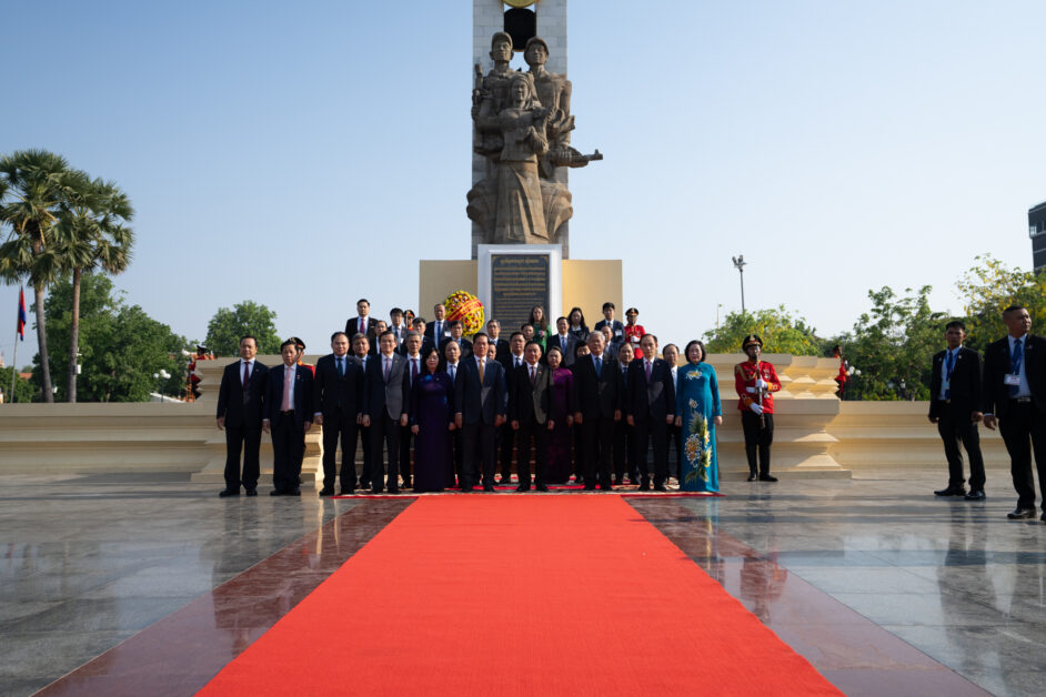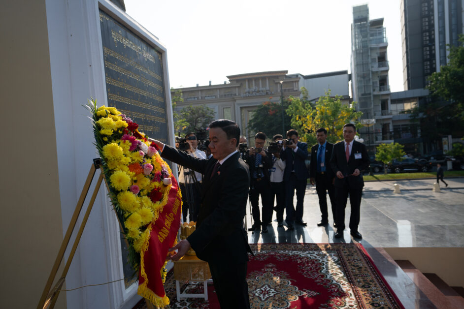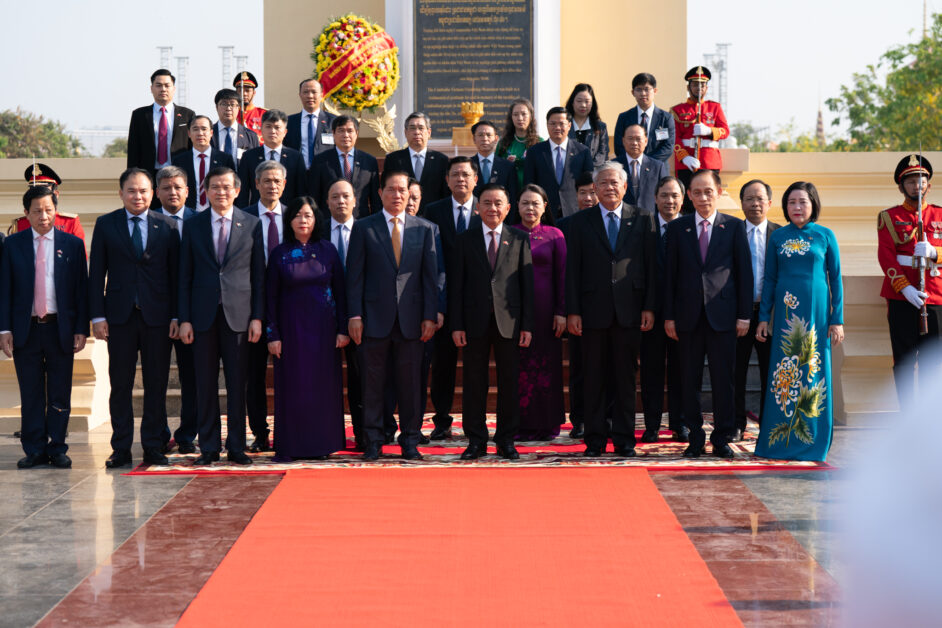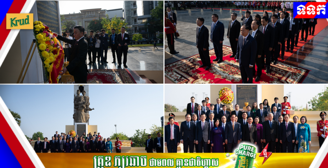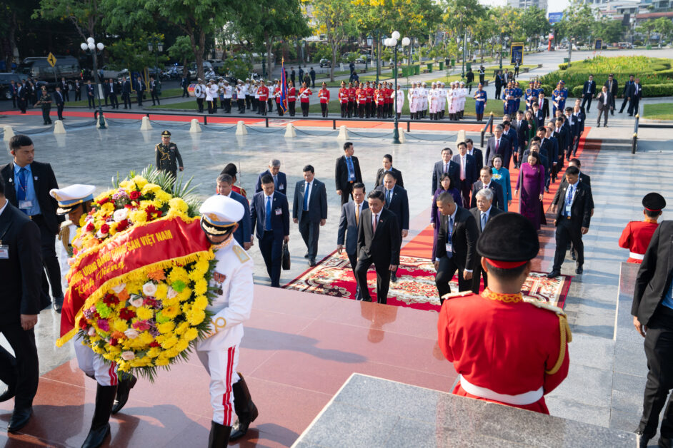 ឯកឧត្តម ត្រិន កឹមទូ (Tran Cam Tu) សមាជិកការិយាល័យនយោបាយ និងជាសមាជិកប្រចាំការគណៈលេខាធិការមជ្ឈិមបក្សកុម្មុយនីស្តវៀតណាម អញ្ជើញដឹកនាំប្រតិភូវៀតណាម ដាក់កម្រងផ្កាគោរពវិញ្ញាណក្ខន្ធនៅស្តូបអនុស្សាវរីយ៍មិត្តភាពកម្ពុជា-វៀតណាម