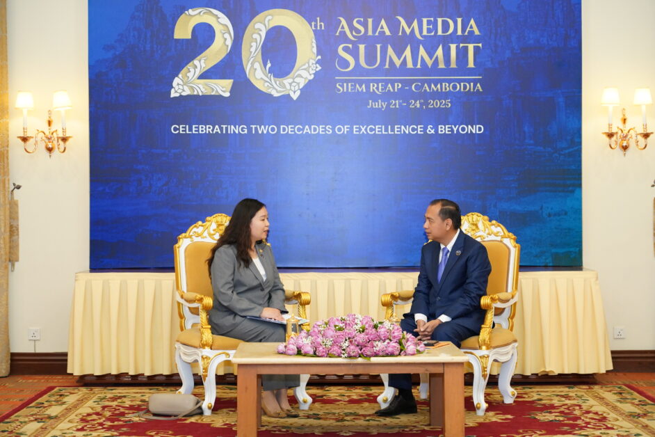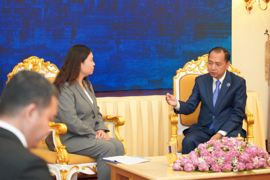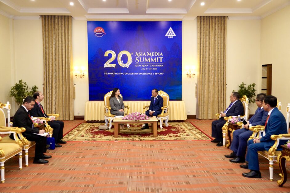ឯកឧត្តម នេត្រ ភក្ត្រា រដ្ឋមន្ត្រីក្រសួងព័ត៌មាននៃព្រះរាជាណាចក្រកម្ពុជា អញ្ជើញជំនួបពិភាក្សាការងារទ្វេភាគីជាមួយ លោកស្រី Wang Yan អគ្គនាយិការង នៃអគ្គនាយកដ្ឋានទំនាក់ទំនងអន្តរជាតិ តំណាង(ASEAN-CHINA Center) ACC ក្នុងព្រឹត្តិការណ៍សន្និសទ្ធីកំពូលប្រព័ន្ធផ្សព្វផ្សាយអាស៊ី លើកទី២០ នៅរសៀលថ្ងៃទី២២ ខែកក្កដា ឆ្នាំ២០២៥ នាសណ្ឋាគារសុខាសៀមរាប។