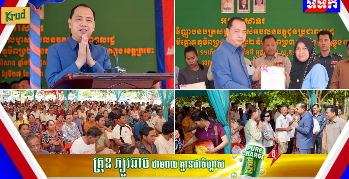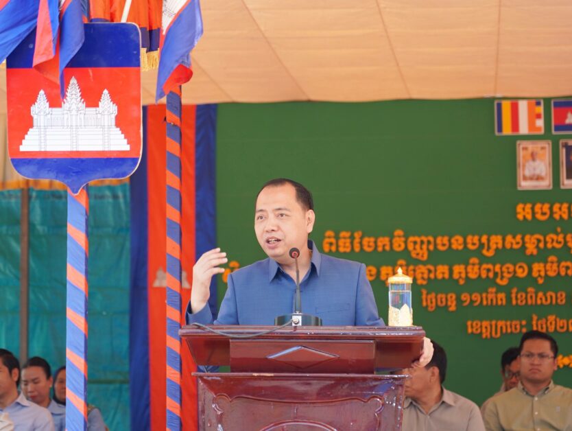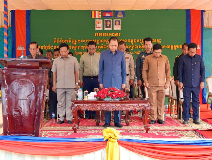 (ក្រចេះ)៖ ឯកឧត្តម នេត្រ ភក្ត្រា រដ្ឋមន្ត្រីក្រសួងព័ត៌មាន និងជាប្រធានក្រុមការងាររាជរដ្ឋាភិបាលចុះមូលដ្ឋានខេត្តក្រចេះ អញ្ជើញជាអធិបតីពិធីចែកវិញ្ញាបនបត្រសម្គាល់ម្ចាស់អចលនវត្ថុ ( បណ្ណកម្មសិទ្ធិ ) ជូនប្រជាពលរដ្ឋដែលមានក្បាលដី ចំនួន ៣,៨២០ ក្បាលដី ស្មើនឹង ២,៣៤០ គ្រួសារ ស្ថិតនៅឃុំពង្រ ស្រុកឆ្លូង ខេត្តក្រចេះ ។