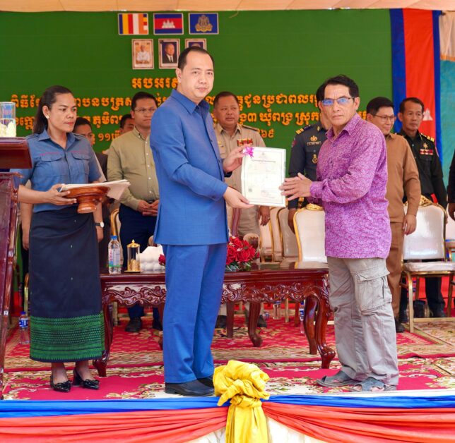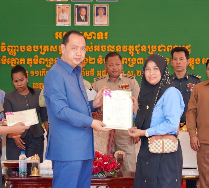ឯកឧត្តម រដ្ឋមន្ត្រី នេត្រ ភក្ត្រា អញ្ជើញចែកវិញ្ញាបនបត្រសម្គាល់ម្ចាស់អចលនវត្ថុជូនប្រជាពលរដ្ឋដែលមានក្បាលដី ស្ថិតនៅឃុំពង្រ ស្រុកឆ្លូង ខេត្តក្រចេះ ដើម្បីកាន់កាប់ដីធ្លីច្បាស់លាស់ មានសុវត្ថិភាព មានមូលដ្ឋានច្បាប់រឹងមាំ ធានាដល់ចរន្តការឯកសារ ការគ្រប់គ្រងបច្ចុប្បន្នភាពព័ត៌មានដីធ្លី និងការពារប្រយោជន៍របស់ប្រជាពលរដ្ឋ