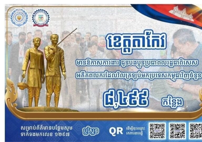 ភ្នំពេញ ៖ ខេត្តតាកែវ កំពុងមានឱកាសការងារជាច្រើនសន្ធឹកសន្ធាប់ សម្រាប់អតីតពលករត្រឡប់មកពីប្រទេសថៃ និងអ្នកកំពុងស្វែងរកការងារធ្វើក្នុងមូលដ្ឋានផ្ទាល់។ នេះបើយោងតាមការ ប្រកាសផ្សព្វផ្សាយ ក្រសួងការងារ និងបណ្ដុះបណ្ដាលវិជ្ជាជីវៈ។
