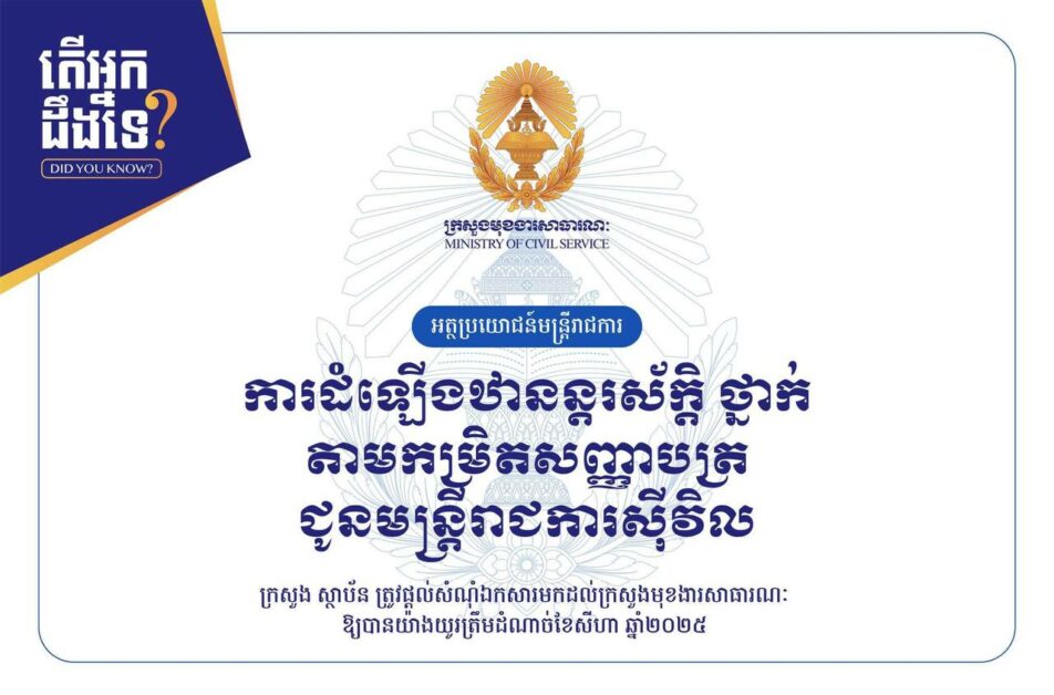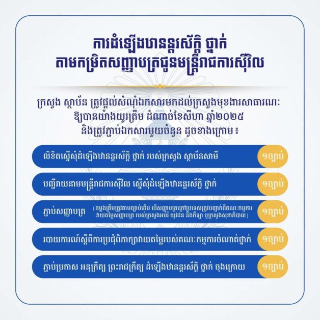 ក្រសួងមុខងារសាធារណៈ រំលឹកដល់ក្រសួង ស្ថាប័ន ផ្តល់សំណុំឯកសារ អំពីការដំឡើងឋានន្តរស័ក្តិ ថ្នាក់ តាមកម្រិតសញ្ញាបត្រជូនដល់មន្ត្រីរាជការស៊ីវិល មកដល់ក្រសួងឱ្យបានយ៉ាងយូរត្រឹម ដំណាច់ខែសីហា ឆ្នាំ២០២៥