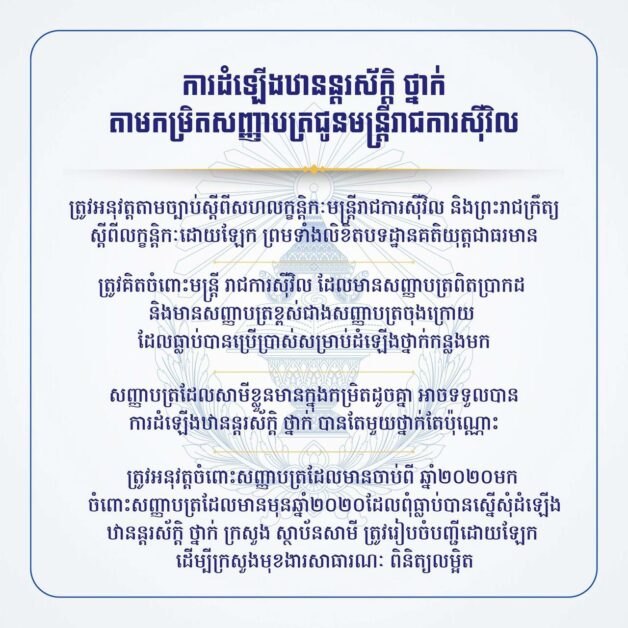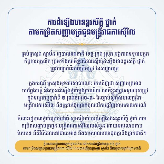 ខ្លឹមសារលម្អិតមានភ្ជាប់ជូនក្នុងលិខិតរំលឹកស្តីពីការដំឡើងឋានន្តរស័ក្តិ ថ្នាក់ តាមកម្រិតសញ្ញាបត្រជូនដល់មន្ត្រីរាជការស៊ីវិល៕