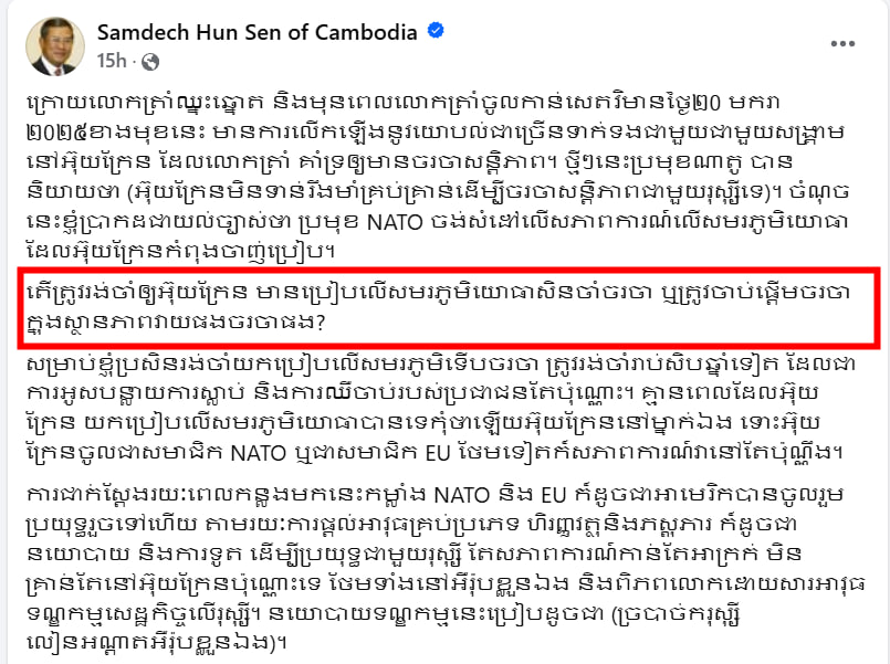 កាលពីយប់មិញនេះសម្តេចតេជោ ហ៊ុន សែន បានបង្ហោះសំណេរលើបណ្តាញសង្គមផ្លូវការរបស់សម្តេចថា៖ ក្រោយលោកត្រាំឈ្នះឆ្នោត និងមុនពេលលោកត្រាំចូលកាន់សេតវិមានថ្ងៃ២០ មករា ២០២៥ខាងមុខនេះ មានការលើកឡើងនូវយោបល់ជាច្រើនទាក់ទងជាមួយជាមួយ សង្គ្រាមនៅអ៊ុយក្រែន ដែលលោកត្រាំគាំទ្រឲ្យមានកិច្ចចរចាសន្តិភាព។ ប៉ុន្តែថ្មីៗនេះប្រមុខណាតូ បាននិយាយថា (អ៊ុយក្រែនមិនទាន់រឹងមាំគ្រប់គ្រាន់ដើម្បីចរចាសន្តិភាពជាមួយរុស្ស៊ីនោះទេ)។ ចំណុចនេះខ្ញុំប្រាកដជាយល់ច្បាស់ថា ប្រមុខ NATO ចង់សំដៅលើសភាពការណ៍លើ សមរភូមិយោធា ដែលអ៊ុយក្រែនកំពុងចាញ់ប្រៀបដែរ។ តើត្រូវរង់ចាំឲ្យអ៊ុយក្រែន មានប្រៀបលើសមរភូមិយោធាសិនចាំចរចា ឬត្រូវចាប់ផ្តើមចរចាក្នុងស្ថានភាពវាយផង ?ចរចាផង?