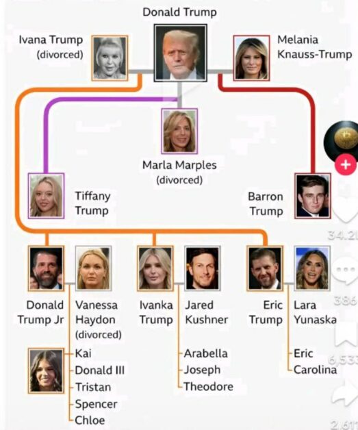 Ivanka Trump និង Eric Trump ។ ចំណែកភរិយាទី២ឈ្មោះថា Maria Marples មានកូនស្រីម្នាក់ឈ្មោះថា Tiffany Trump និងភរិយាទី៣ គឺជាស្រ្តីទី១ ចំនួន២អាណត្តិដែរ គឺលោកស្រី Melania Knauss-Trump មានកូនប្រុសទោលម្នាក់ គឺយុវជន Barron Trump នេះឯង ដូច្នេះយើងនឹងរង់ចាំមើលថាតើ Barron Trump នឹងបង្កើតស្នាដៃអ្វីខ្លះ សម្រាប់អាណត្តិថ្មីរបស់លោក Donald Trump ជាបន្តបន្ទាប់?